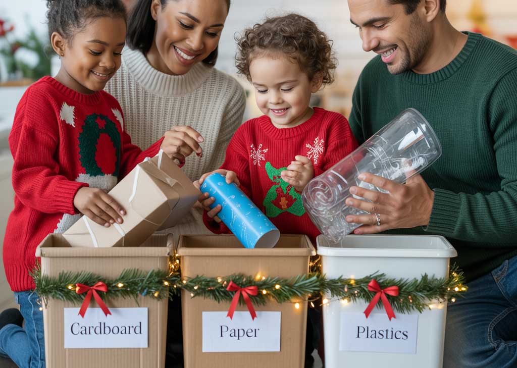 Separate cardboard, paper, plastics, and metals right after opening gifts so everything stays clean and recyclable. -